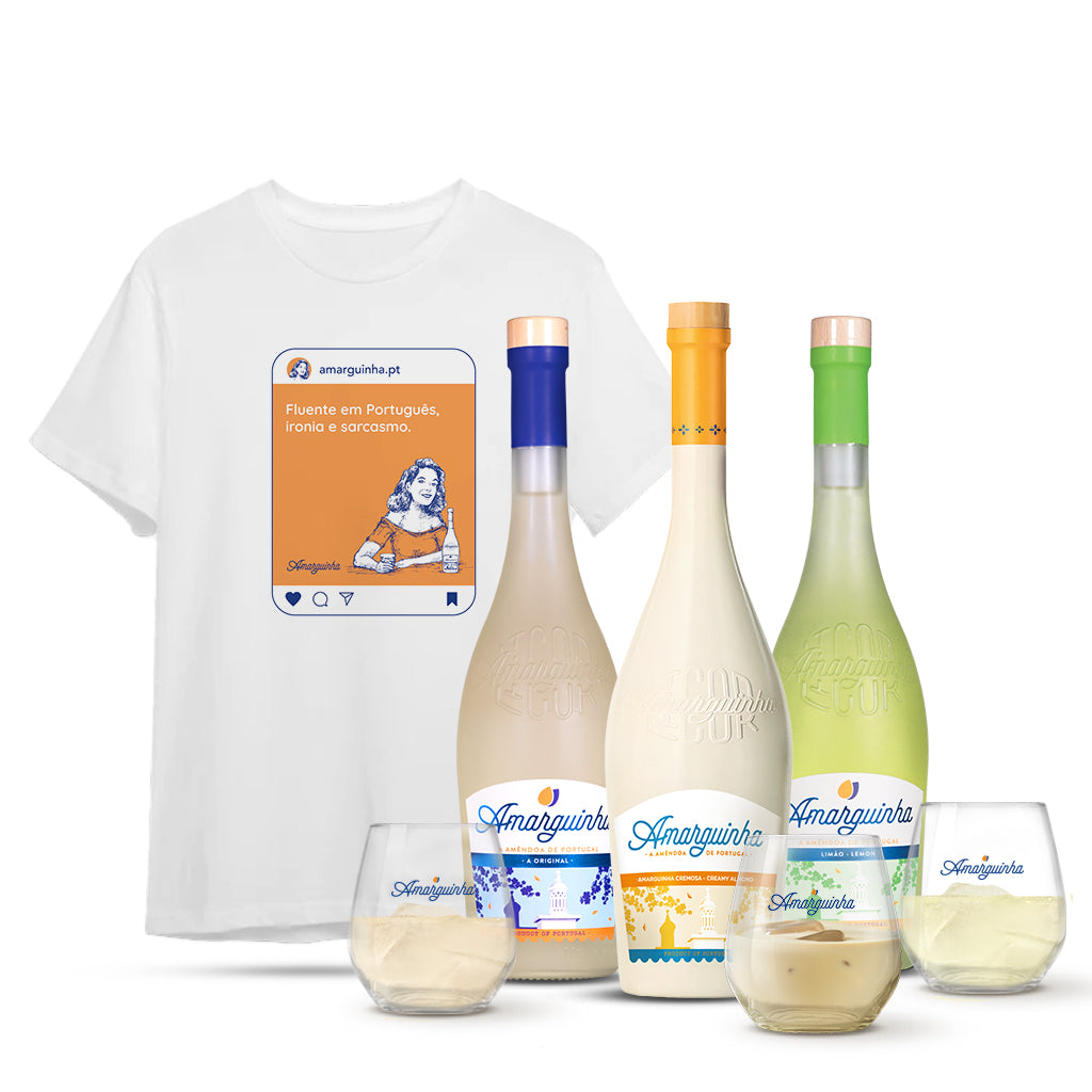 Trois bouteilles (Original, Citron… et la nouvelle Crème), trois verres et – si le t-shirt vous va bien… – un t-shirt très sarcastique. Ce coffret contient bien plus que l'essentiel : il apporte de la joie à la mode Amarguinha. Commandez le vôtre : il est disponible exclusivement sur notre boutique en ligne !
